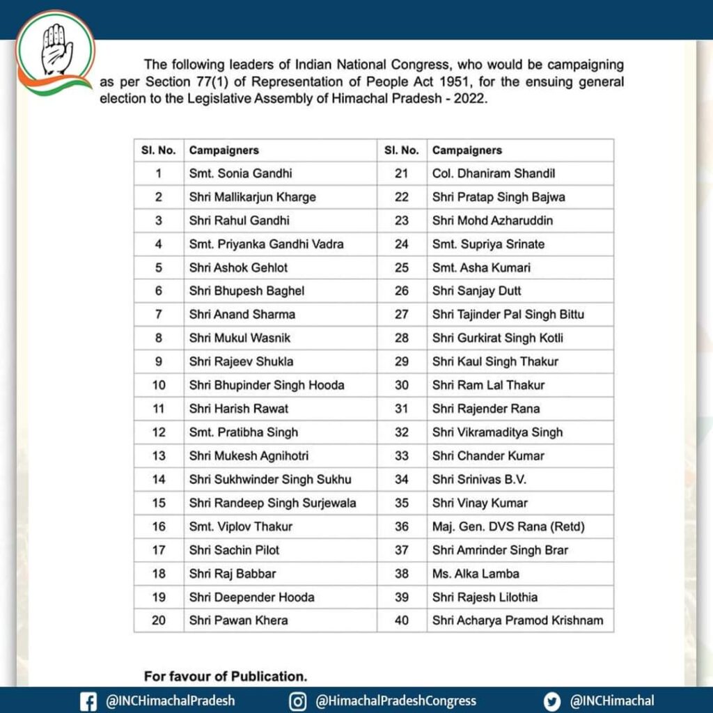 हिमाचल विधान सभा चुनाव के लिए भाजपा द्वारा अपने 40 स्टार प्रचारको की लिस्ट जारी करने के बाद अब हिमाचल कांग्रेस ने भी अपने स्टार प्रचारको की लिस्ट जारी कर दी है । हिमाचल विधानसभा चुनाव के लिए कांग्रेस ने अपने 40 स्टार प्रचारकों की सूची जारी कर दी है। मिली जानकारी के मुताबिक इसमें ऑल इंडिया कांग्रेस कमेटी की पूर्व अध्यक्ष सोनिया गांधी, वर्तमान अध्यक्ष मल्लिकार्जुन खडग़े, पूर्व अध्यक्ष राहुल गांधी व एआईसीसी महासचिव प्रियंका गांधी वाड्रा के नाम शामिल हैं। स्टार प्रचारकों में राजस्थान के मुख्यमंत्रीअशोक गहलोत और छत्तीसगढ़ के मुख्यमंत्री भूपेश बघेल को भी शामिल किया है। इसके अलावा आनंद शर्मा, मुकुल वासनिक, हिमाचल कांग्रेस प्रभारी राजीव शुक्ला, हरियाणा के पूर्व मुख्यमंत्री भूपेंद्र सिंह हुड्डा, उत्तराखंड के हरीश रावत, प्रदेश कांग्रेस अध्यक्ष प्रतिभा सिंह, नेता प्रतिपक्ष मुकेश अग्निहोत्री व कैंपेन कमेटी के अध्यक्ष सुखविंदर सिंह सुक्खू, हरियाणा से रणदीप सिंह सुरजेवाला के आलावा