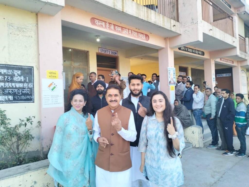 उधर दून विधान सभा चुनाव क्षेत्र के कांग्रेस के प्रत्याशी पूर्व विधायक राम कुमार चौधरी अपने परिवार के साथ मतदान करने बाद मतदान का निशान दिखाते हुए बाहर आए । यहां ये भाजपा के निवर्तमान विधाययक परमजीत सिंह पम्मी भी मतदान के चुके है ।