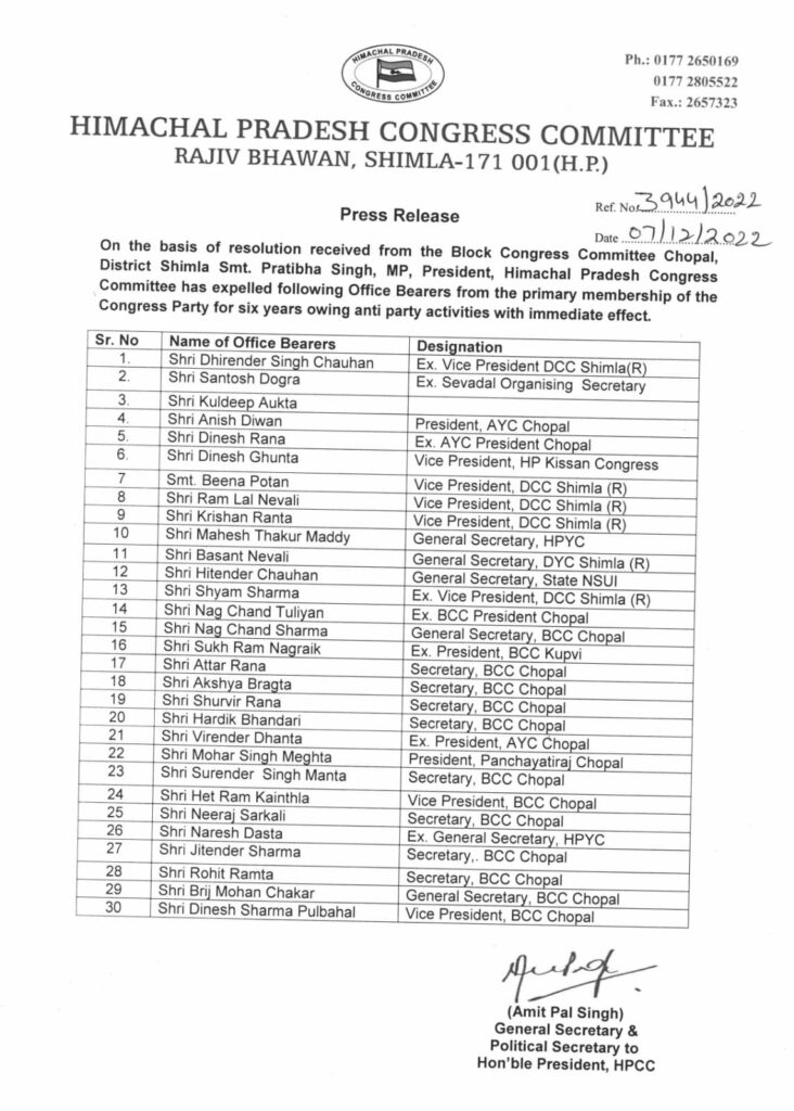 /चुनाव परिणाम घोषित होने के पहले निकाले गए शिमला जिले के 30 कांग्रेस पार्टी के पदाधिकारी