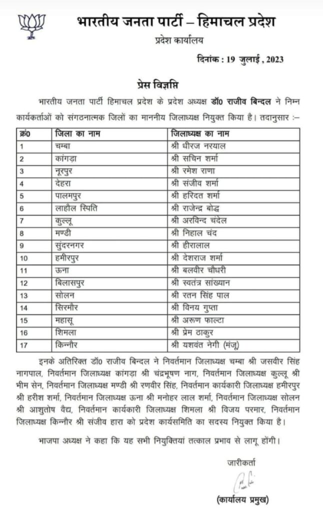 हिमाचल में भी 2024 के होने वाले लोक सभा चुनाव के लिए राजनैतिक पार्टियो द्वारा अभी से तैयारियां करनी शुरू कर दी है । भारतीय जनता पार्टी हिमाचल के सभी जिला अध्यक्षेा की नियुक्तियां करके पुराने अध्यक्षो को बदल दिया गया है ।