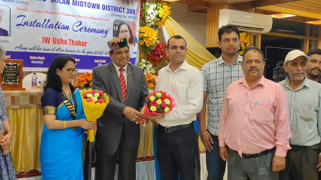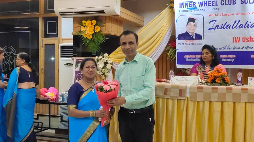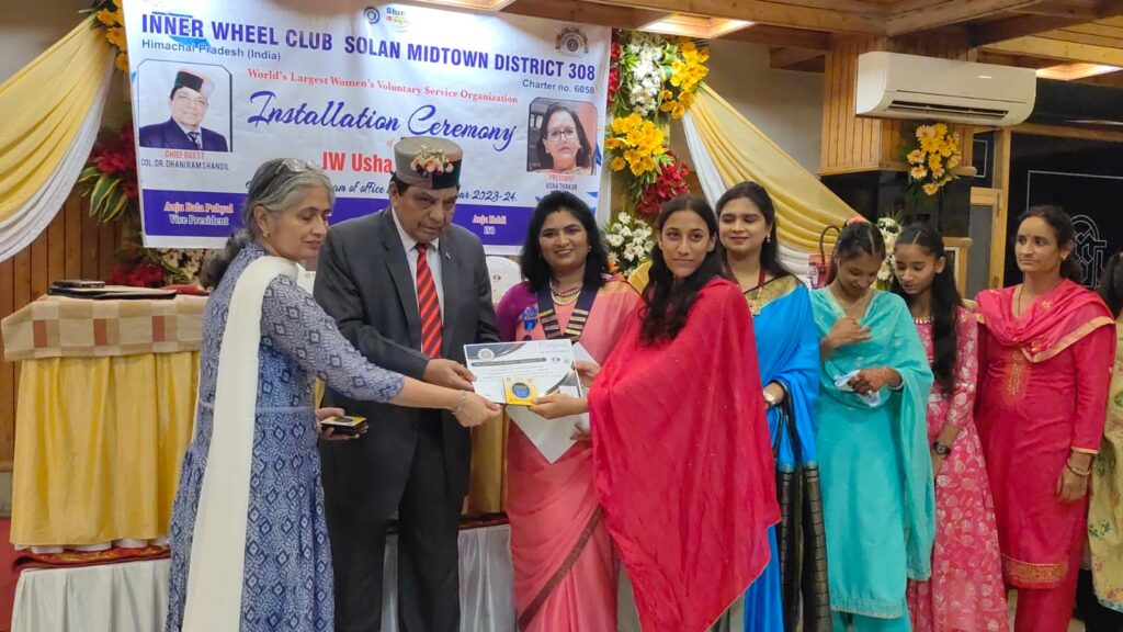 इनरव्हील क्लब सोलन मिडटाउन का अधिष्ठापन समारोह धूमधाम के साथ मनाया गया। कार्यक्रम में स्वास्थ्य एवं परिवार कल्याण मंत्री कर्नल धनीराम शांडिल ने मुख्य अतिथि के रूप में शिरकत की। इस दौरान जोनल क्लब कोऑर्डिनेटर सविता भल्ला विशेष रूप से उपस्थित रही। कार्यक्रम का आगाज मुख्य अतिथि द्वारा दीप प्रज्वलित कर किया गया। वही बालिकाओं द्वारा गणेश वंदना प्रस्तुत की गई। इस अवसर पर क्लब की पूर्व प्रधान मोनिका बंसल ने ऊषा ठाकुर को कोलर पहनाकर प्रधान की जिम्मेवारी सौंपी।