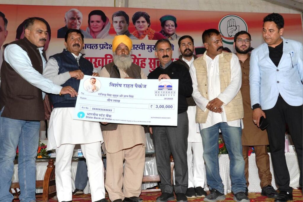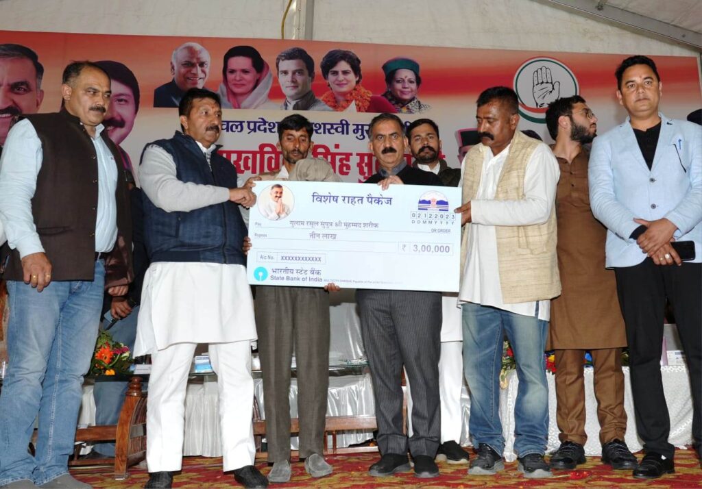 मुख्यमंत्री ने कहा कि इस वर्ष बरसात में भारी बारिश एवं भूस्खलन से आई आपदा से हिमाचल प्रदेश में 16 हजार घरों को नुकसान पहुंचा। लोगों के दर्द से वे वाकिफ हैं, इसलिए आर्थिक तंगी के बावजूद व नियमों में बदलाव कर राज्य सरकार ने 4500 करोड़ रुपए का विशेष पैकेज आपदा प्रभावितों को दिया। उन्होंने कहा कि इसके तहत पूरी तरह से क्षतिग्रस्त घर के लिए 1.30 लाख रुपये के मुआवजे को साढ़े पांच गुणा बढ़ाकर सात लाख रुपये किया गया है। कच्चे मकान के आंशिक रूप से क्षतिग्रस्त होने पर मुआवजे को 25 गुणा बढ़ाते हुए 4000 रुपये से एक लाख रुपये तथा पक्के घर को आंशिक क्षति होने पर मुआवजे को साढ़े 15 गुणा बढ़ाकर एक लाख रुपये किया गया है। इसके साथ-साथ बिजली व पानी का फ्री कनेक्शन तथा 280 रुपए प्रति बोरी की दर से सीमेंट उपलब्ध करवाया जा रहा है।