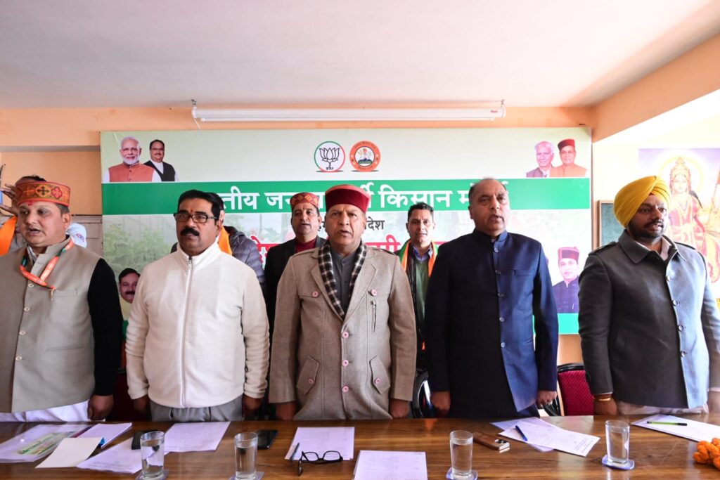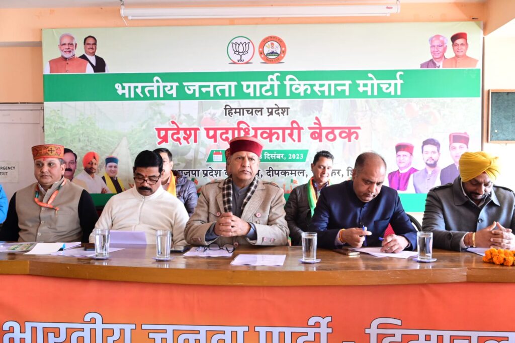 भाजपा किसान मोर्चा की पदाधिकारी बैठक का आयोजन दीप कमल चक्कर शिमला में हुआ, बैठक की अध्यक्षता किसान मोर्चा के अध्यक्ष संजीव देष्टा की। बैठक में नेता प्रतिपक्ष जयराम ठाकुर, भाजपा प्रदेश अध्यक्ष डॉ राजीव बिंदल, संगठन महामंत्री सिद्धार्थन और प्रदेश महामंत्री बिहारी लाल शर्मा विशेष रूप से उपस्थित रहे।