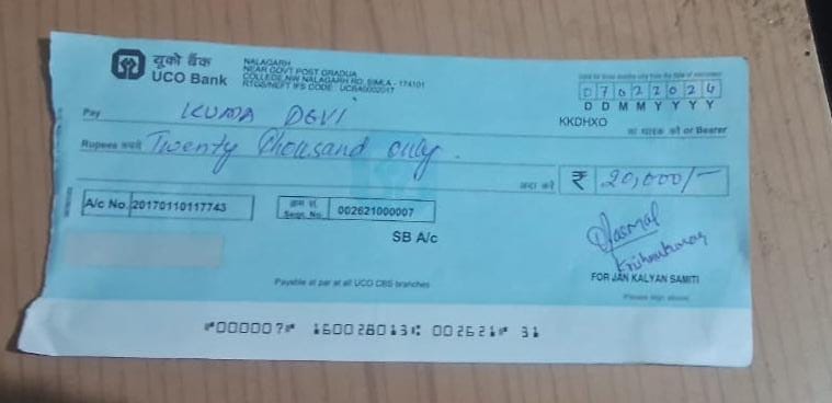 जनकल्याण समिति द्वारा आज अक्षय ठाकुर पुत्र उमाकांत, गांव बुखारी दा घाट ,तहसील नालागढ़ ,जिला सोलन पीड़ित परिवार को₹20000 का चैक बतौर सहायता के रूप में दिया गया।