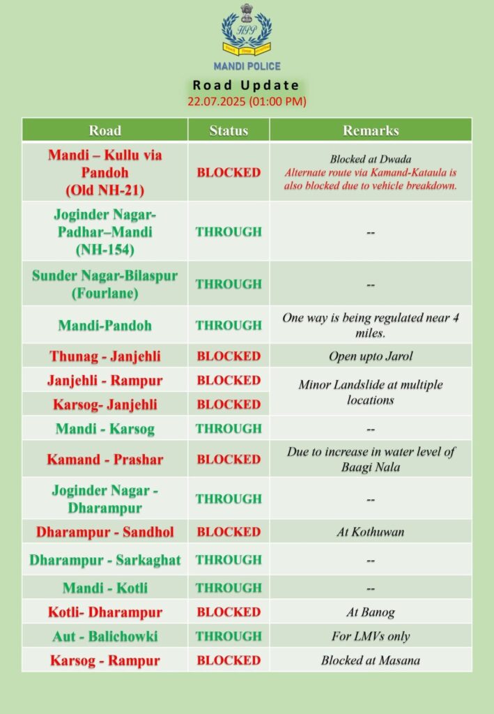 आज दोपहर तक मण्डी जिले की आठ सडके बन्द पडी है जबकि आठ ब्लाक स्डको को आवाजाही के लिए खोल दिया गया है । इस बारे में मण्डी पुलिस द्वारा जानकारी सांझी की है ।