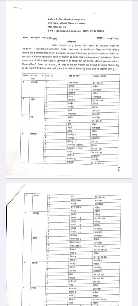पंचायती राज संस्थाओं के सामान्य निर्वाचन–2025 की तैयारियों के तहत नालागढ़ विकास खंड की 72 ग्राम पंचायतों के वार्डों की आरक्षण सूची जारी कर दी गई है। यह अधिसूचना खंड विकास अधिकारी एवं रिटर्निंग ऑफिसर (पंचायत) नालागढ़, नियोल धैर्य शर्मा द्वारा जारी की गई।