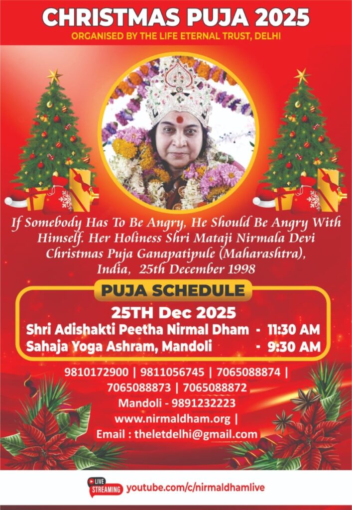 सहज योग के द लाइफ एटरनल ट्रस्ट, दिल्ली द्वारा आयोजित क्रिसमस पूजा 2025 का आयोजन 25 दिसंबर को श्रद्धा और उत्साह के साथ मनाया जाएगा। इस अवसर पर श्रद्धालु श्री माताजी निर्मला देवी जी के पावन स्मरण और शिक्षाओं के साथ सामूहिक ध्यान एवं पूजा में भाग लेंगे।