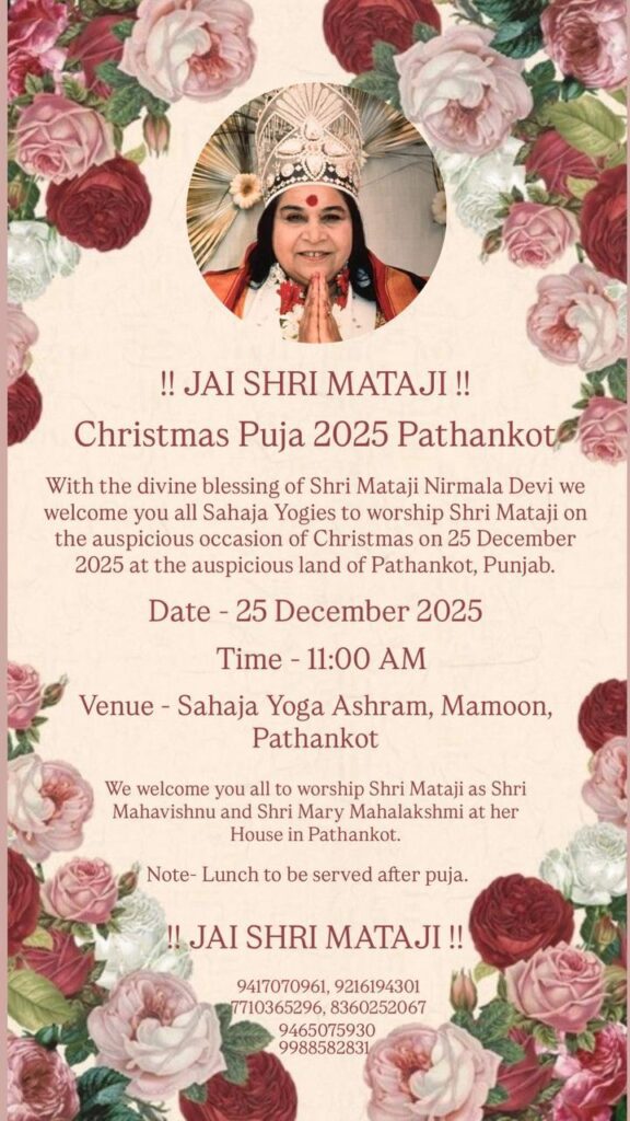 सहज योग पठानकोट सामूहिक द्वारा भी कल क्रिसमस पूजा 2025 का पावन आयोजन (गुरुवार) को प्रातः 11:00 बजे एच.एच. श्री माताजी निर्मला देवी मंदिर, ममून, पठानकोट में श्रद्धा और भक्ति के साथ किया जाएगा।