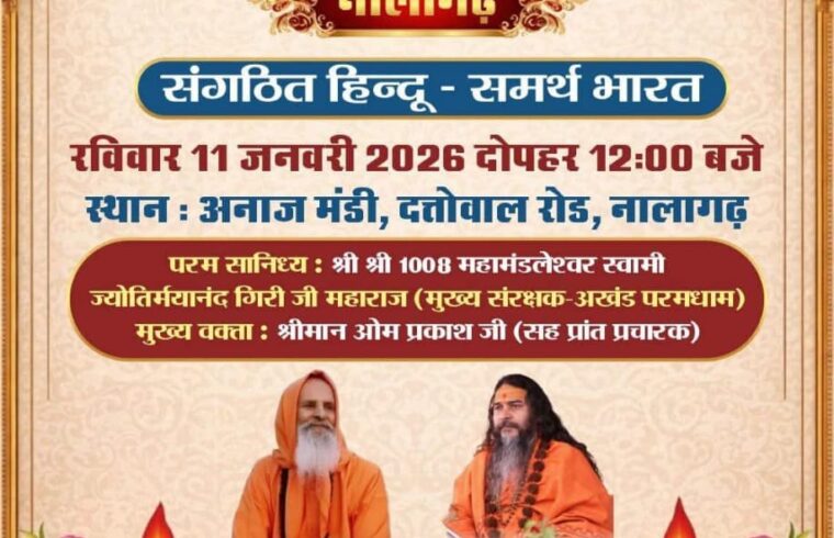 औद्योगिक नगरी बीबीएन के नालागढ़ में विशाल हिंदू सम्मेलन का आयोजन किया जा रहा है। यह सम्मेलन रविवार, 11 जनवरी 2026 को दोपहर 12:00 बजे आयोजित होगा।