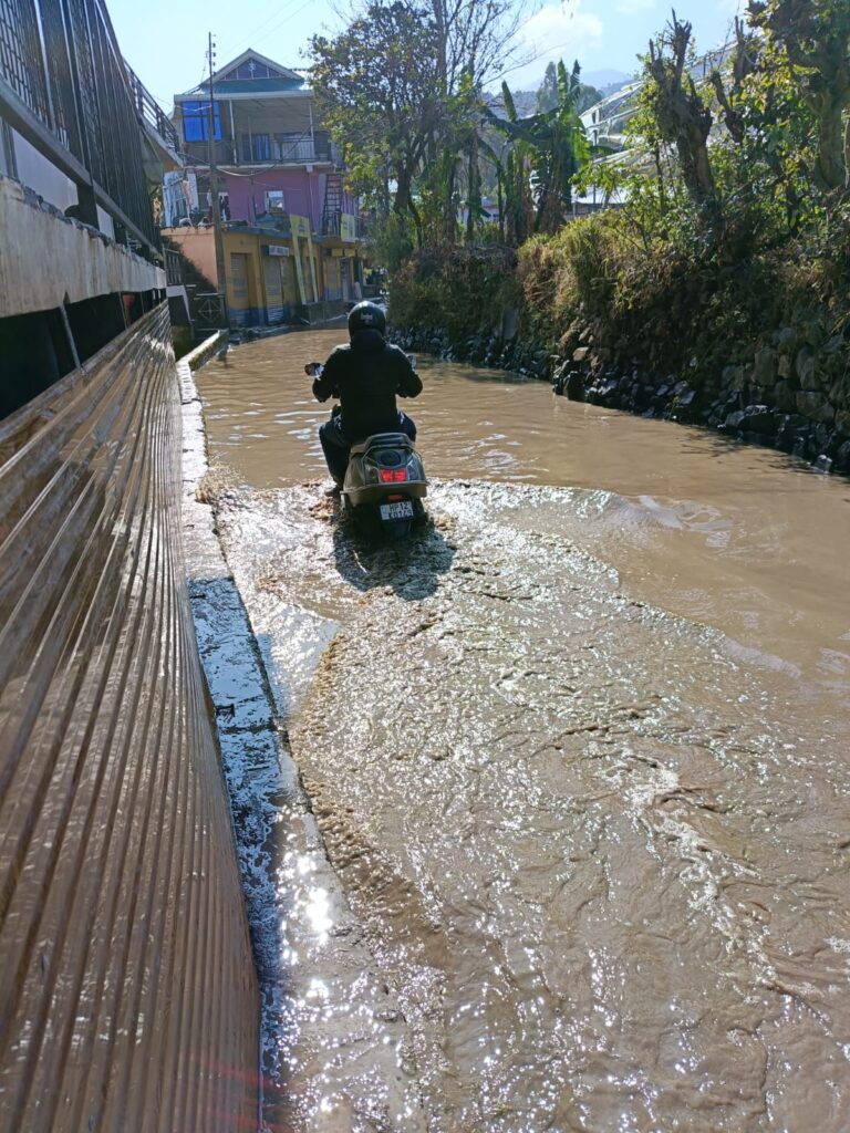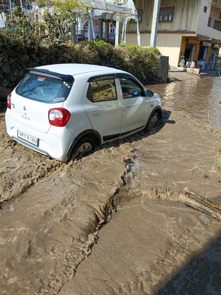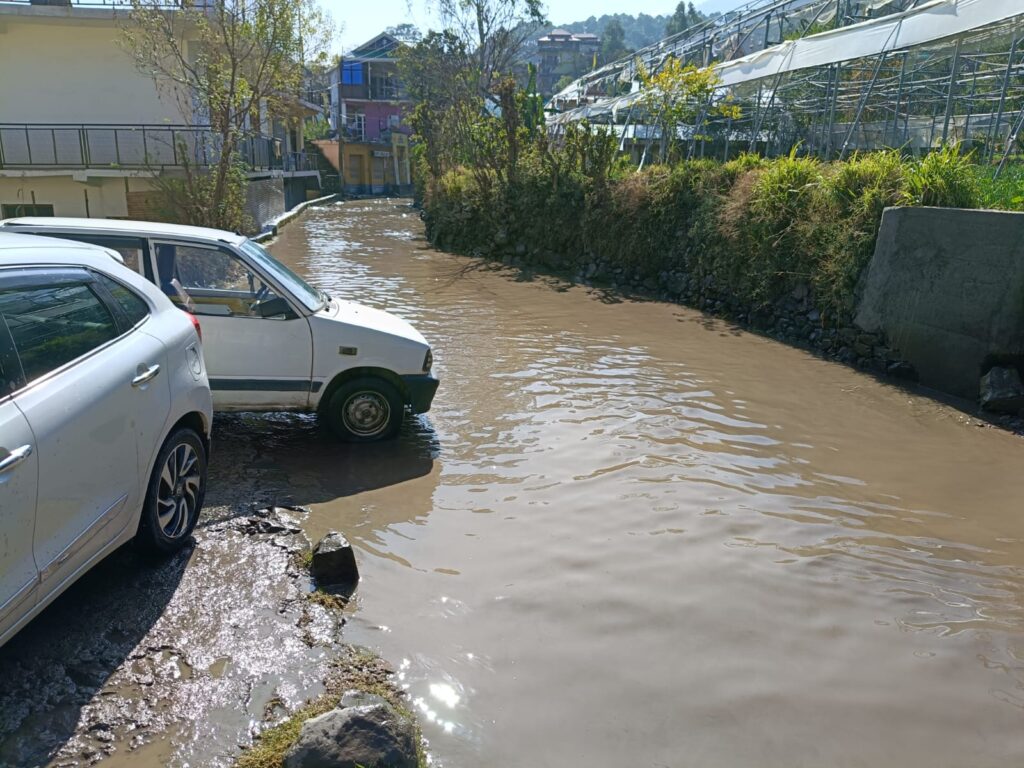 हिमाचल प्रदेश के सोलन जिले की धुंदन पंचायत से गुजरने वाले राज्य मार्ग पर धुंदन स्कूल एवं राम मंदिर के सामने वर्षा का पानी जमा होने से सड़क तालाब का रूप ले चुकी है।