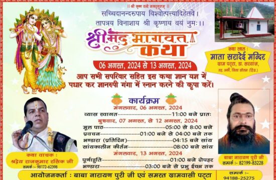 सोलन (अर्की ) 23 जुलाई,हिम नयन न्यूज /ब्यूरो/ वर्मा सोलन जिले के अर्की जनपद की बाडीधार गांव पट्टा सरयांज में 06 अगस्त से 13 अगस्त तक श्री मद्भागवत कथा का आयोजन किया जा रहा है…